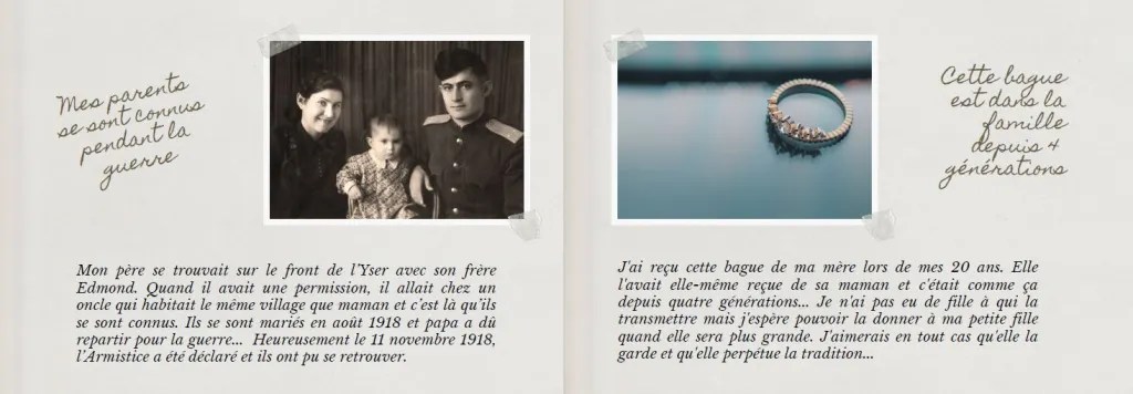 Le livre photo permet de parcourir les chemins de la mémoire de manière ludique… Derrière un objet comme une bague ou une médaille se cache en fait souvent toute une histoire… De même pour les photos, qui vont réveiller des souvenirs. À la clé, des anecdotes précieuses que le livre photo permettra d’immortaliser.