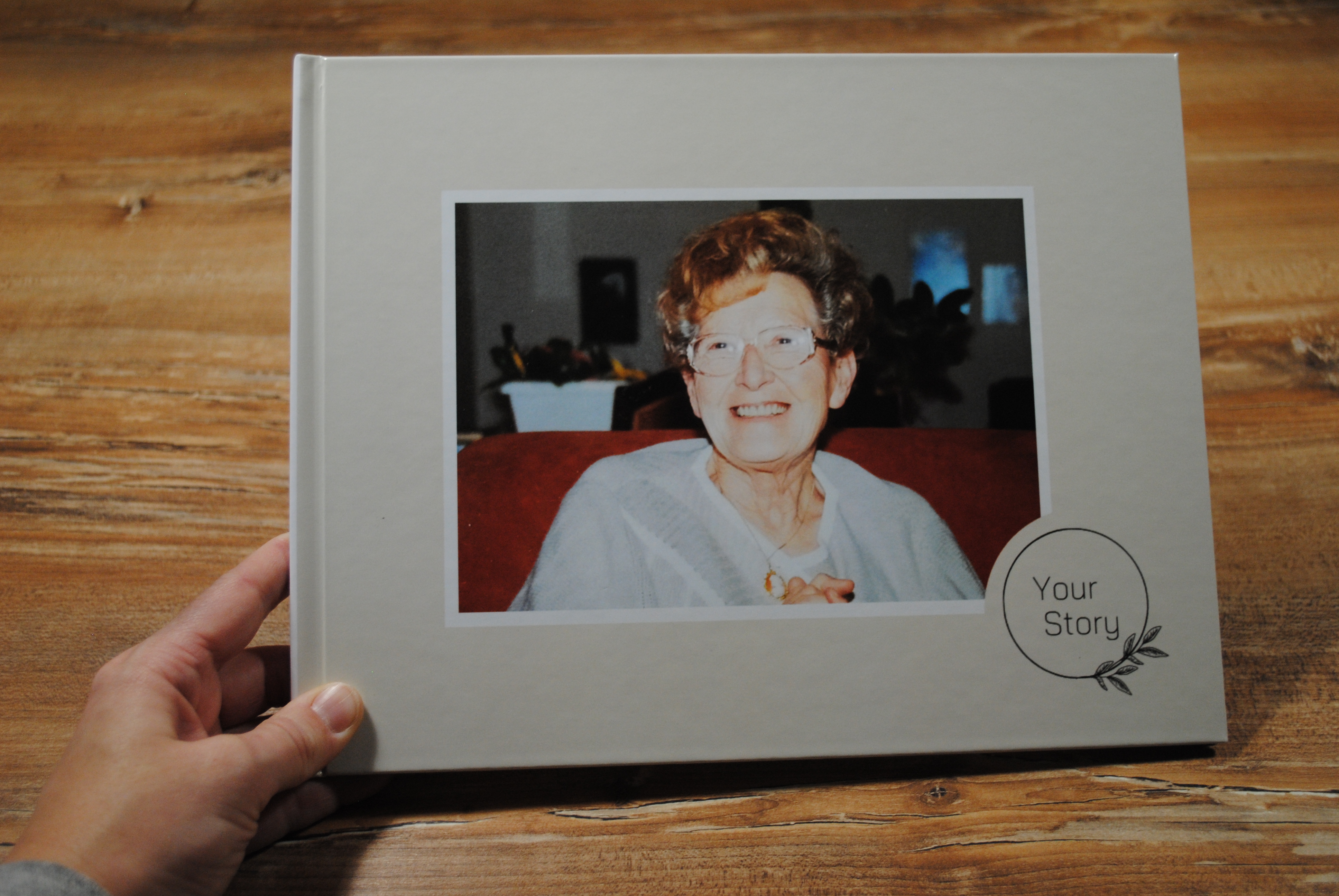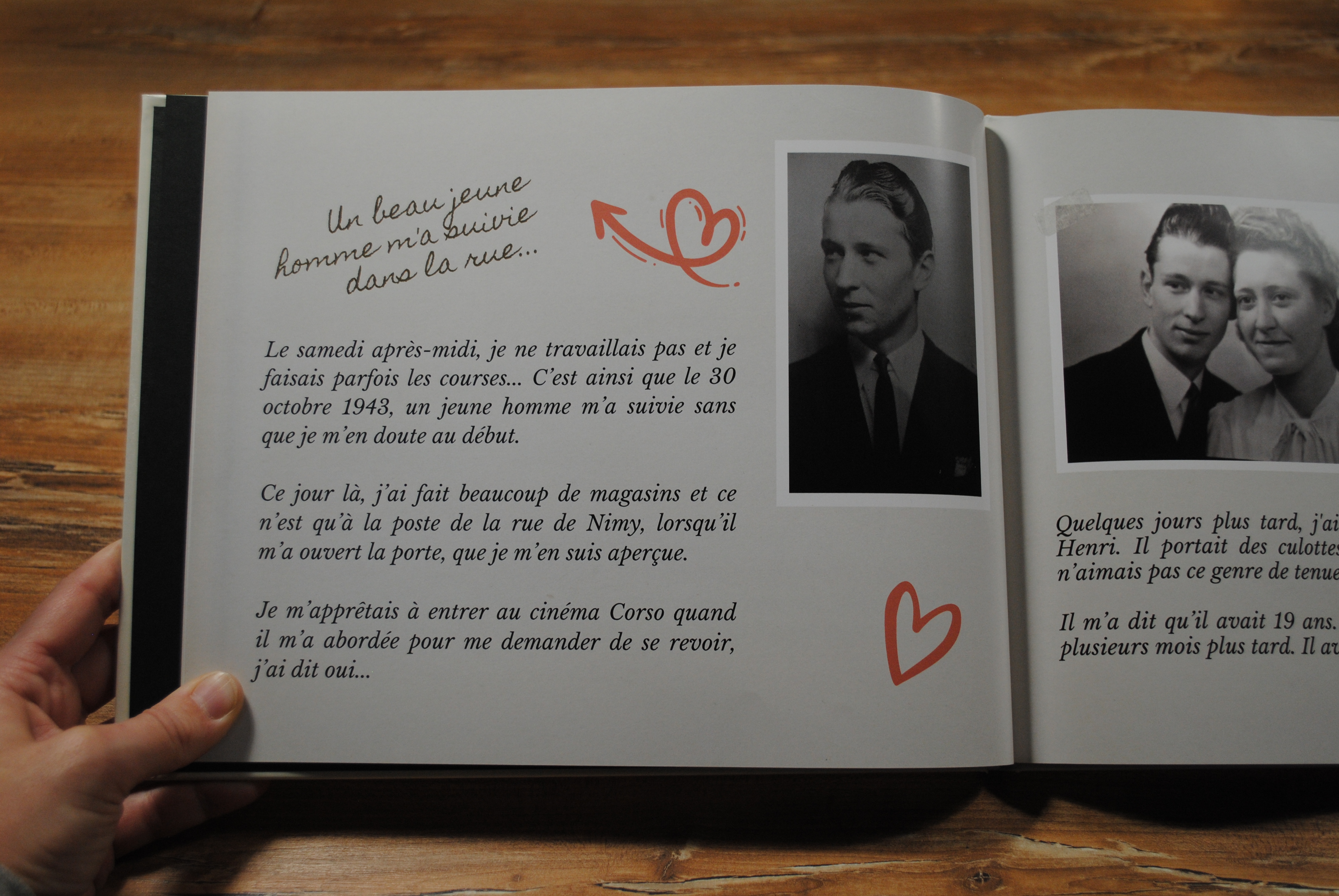 Une fois le texte validé, je crée un beau livre qui associe les photos et les anecdotes, ainsi qu’une photo de la personne en couverture. Il vous sera livré chez vous et vous pourrez le découvrir ensemble lors de votre prochaine visite !